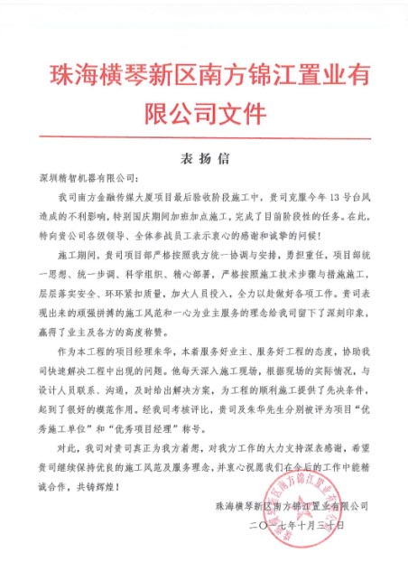 項目建設(shè)過程中,精智項目組克服強臺風 “天鴿”造成的直面性攻擊,并在國慶期間加班加點,以客觀、務實、勤勉的工作態(tài)度,得到了業(yè)務公司的一致認可,獲得了項目表揚信,我司及項目經(jīng)理朱華先生分別獲得“優(yōu)秀施工單位”及“優(yōu)秀項目經(jīng)理”的榮譽。