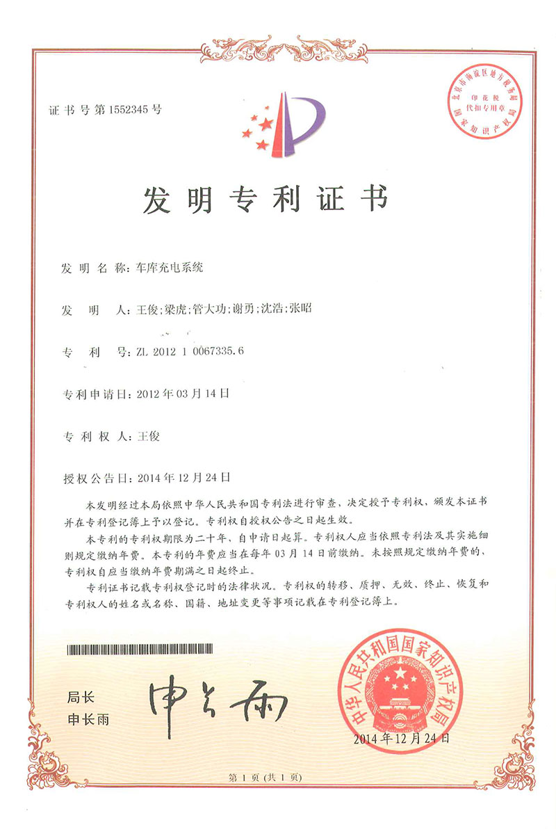 • 車庫(kù)充電系統(tǒng)-專利證書(shū)