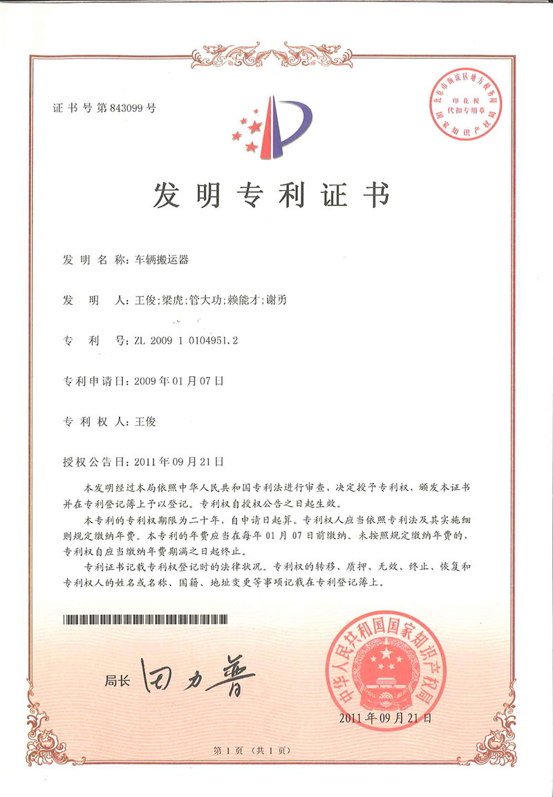• 車輛搬運(yùn)器-專利證書(shū)